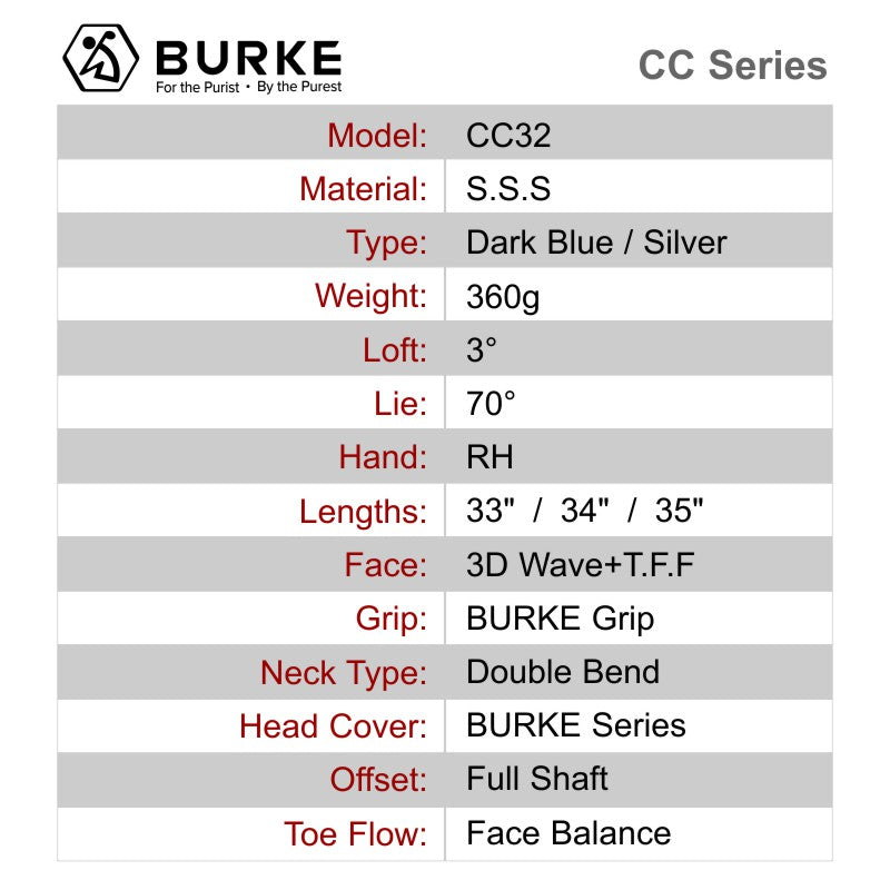 CC32 は、安定性の要求を満たすクラシックな馬蹄型フルマレット デザインです。Heat-Tec™ を使用した 303 ステンレス鋼で鍛造された CC 32 は、シングル ベンド シャフトとフル オフセットを特徴とし、フェース バランスのとれたトゥ ハングとストレート バック ストレート スルー ストロークを好むプレーヤーに最適です。