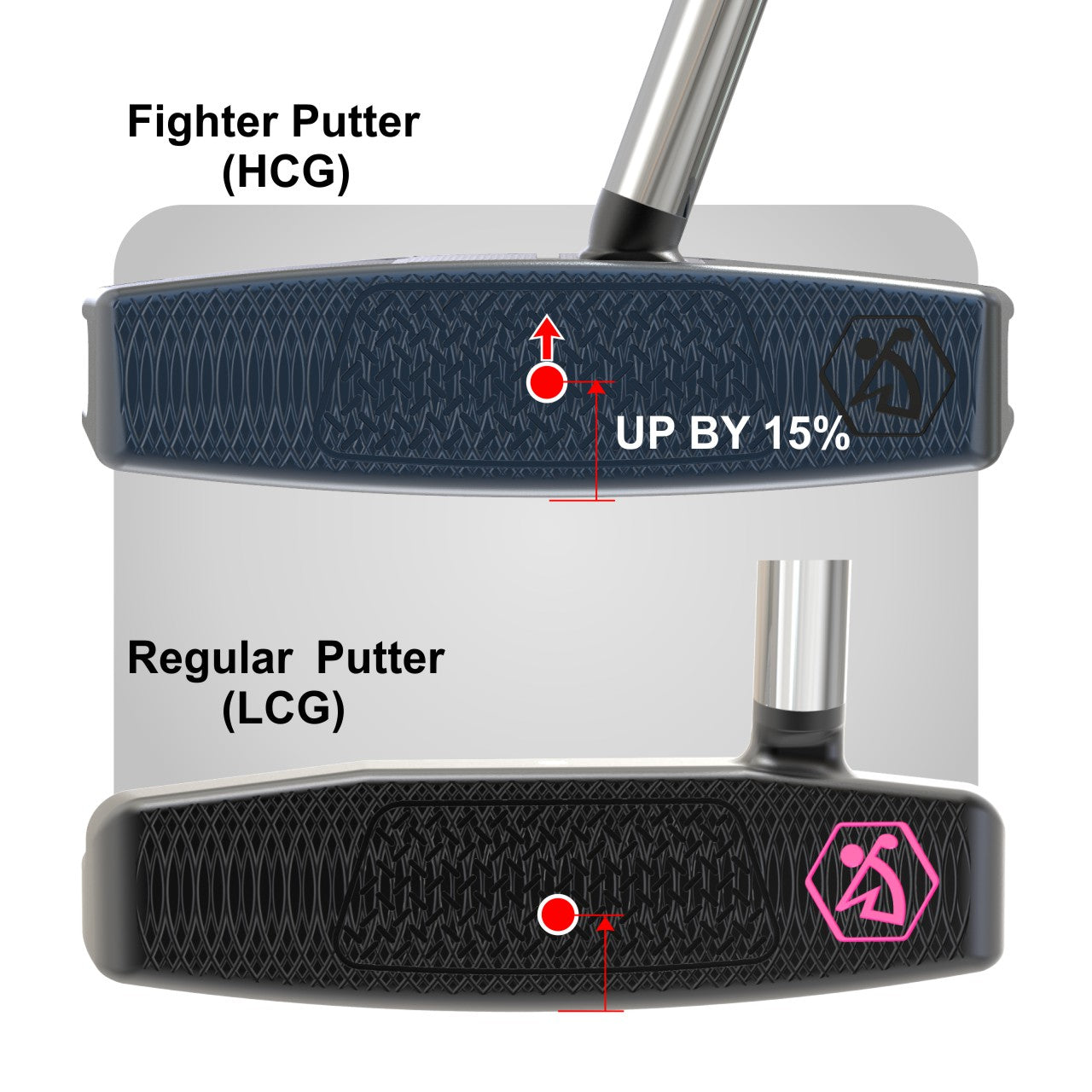 In the design of golf putters,the distribution of the center of gravity(CG)plays a crucial role in the striking effect.The BURKE Fighter series putters feature a unique high-CG structure design,raising the CG position by 15%compared to conventional putters.The core purpose of this innovative design is to enhance the forward roll of the ball upon impact.When the putter strikes the ball,the high-CG structure allows the ball to gain more forward rolling force instantly.This reduces the sliding distance of the ball on the ground and minimizes the impact of uneven surfaces on the ball's path.This design not only improves the accuracy of the strike but also helps golfers better control the ball's trajectory,achieving an ideal putting effect.