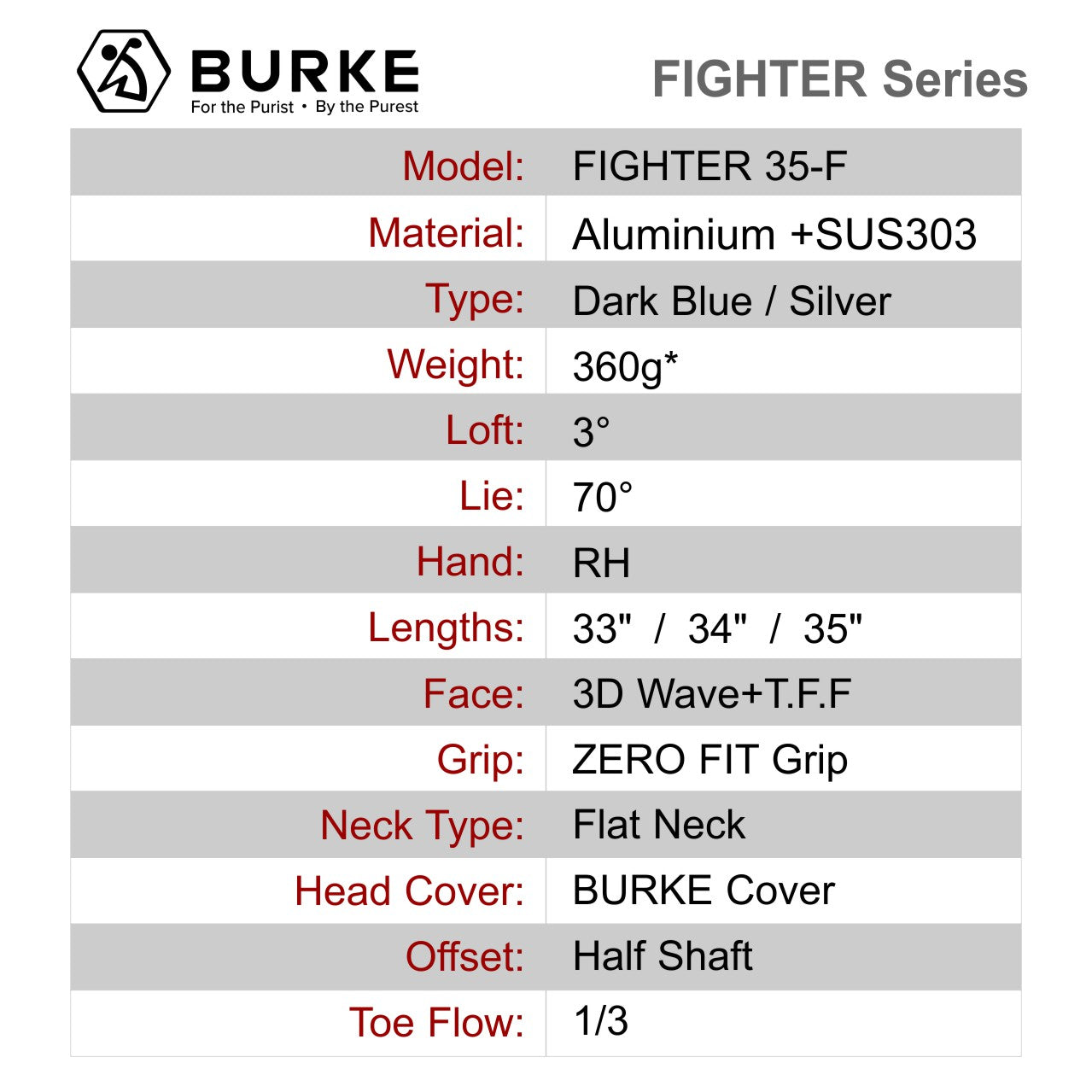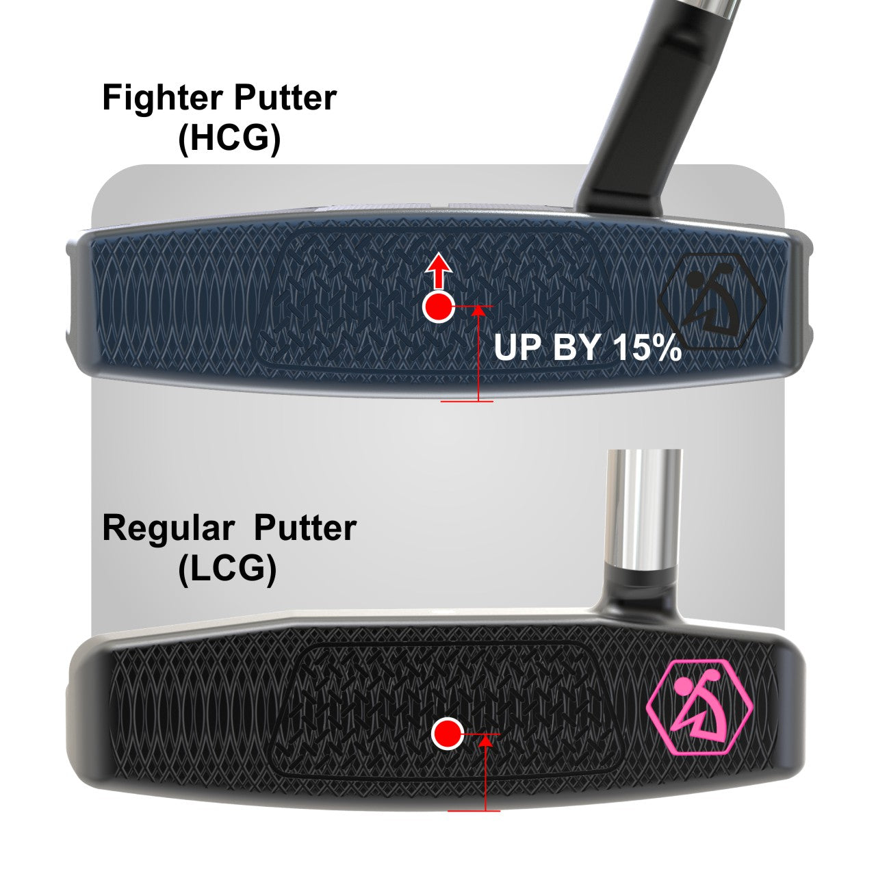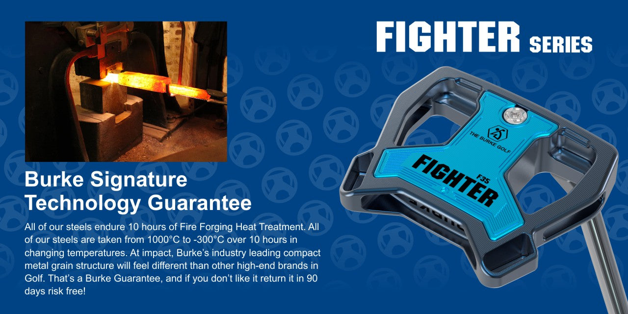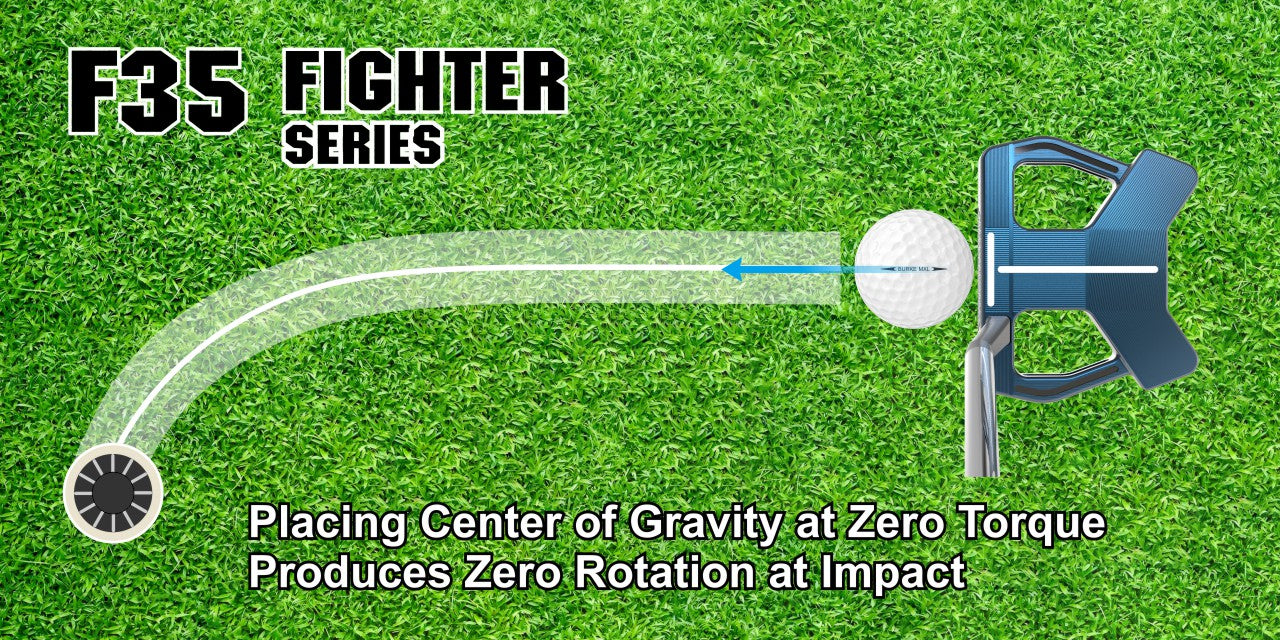 In the design of golf putters, the distribution of the center of gravity (CG) plays a crucial role in the club twisting. The BURKE Fighter series putters feature a uniquely HIGH CG placement, raising the CG position by 15%compared to conventional putters. The purpose of this innovative design is to enhance the forward roll of the ball upon impact. When the putter strikes the ball, the high CG allows the ball to gain more forward rolling force instantly.This reduces the skidding of the ball on the ground and minimizing the impact of uneven surfaces on the ball's path. This design not only improves the impact precision but also helps golfers better control the ball's roll, allow the ball to travel down the desired line.