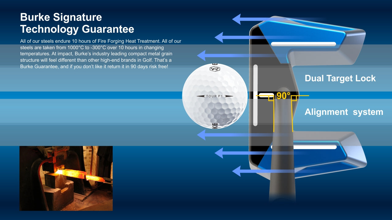In the design of golf putters,the distribution of the center of gravity(CG)plays a crucial role in the striking effect.The BURKE Fighter series putters feature a unique high-CG structure design,raising the CG position by 15%compared to conventional putters.The core purpose of this innovative design is to enhance the forward roll of the ball upon impact.When the putter strikes the ball,the high-CG structure allows the ball to gain more forward rolling force instantly.This reduces the sliding distance of the ball on the ground and minimizes the impact of uneven surfaces on the ball's path.This design not only improves the accuracy of the strike but also helps golfers better control the ball's trajectory,achieving an ideal putting effect.