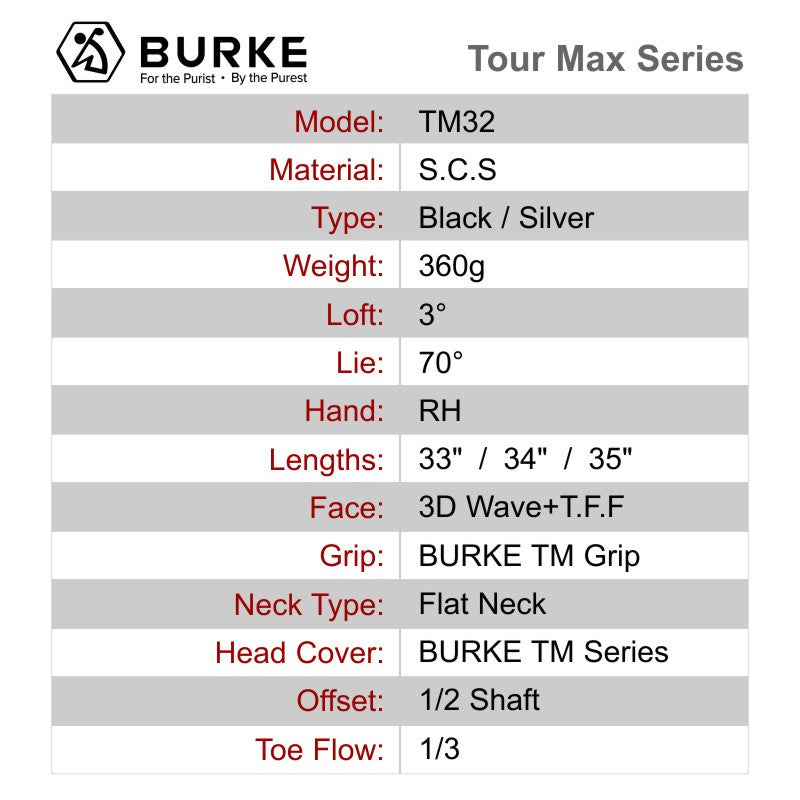 The TM32 from Burke Golf aims to appease blade lovers with a mid-mallet shape. 10 Hours Fire-Forgedâ„¢ from soft carbon steel, the TM32 suits compact demands of a blade and the confidence of mallets. The TM32 features a flat neck design with half offset for those that love the classic blade design but prefer 1/2 toe hang offset.
